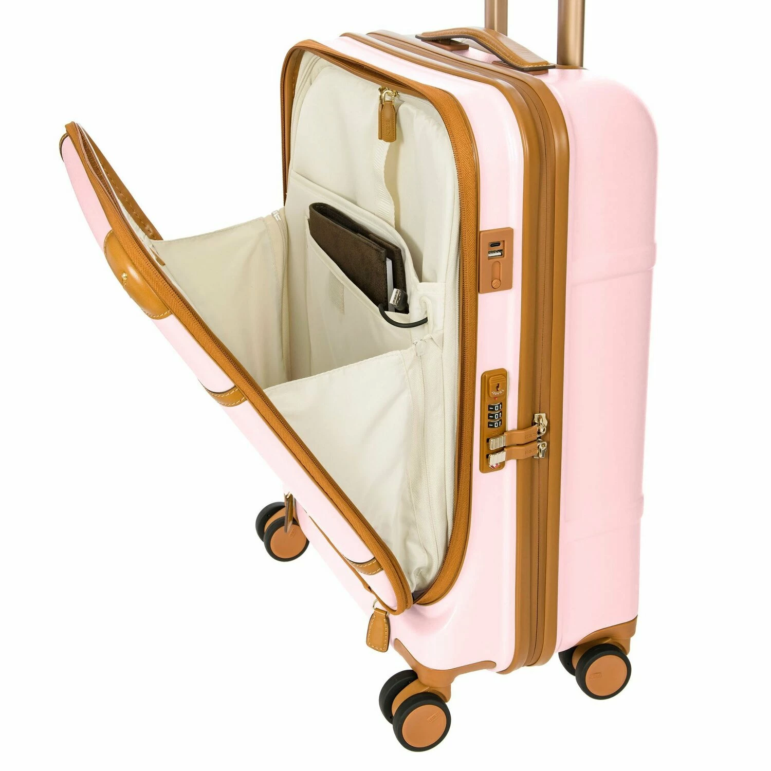 Der stabile Kabinentrolley aus der Serie Bellagio ist aus robustem Polycarbonat hergestellt und mit Leder abgesetzt. Vier geräuscharme und leicht zu manövrierende Doppelrollen sorgen für ein angenehmes Fahren. Der Trolley verfügt über ein geräumiges Hauptfach mit einem Raumteiler und einem Wäschefach und bietet somit viel Platz und optimale Übersicht. Die Vortasche beinhaltet weitere Fächer sowie gepolstertes Laptop- und Tabletfach. Integrierter Anschluss für USB und Mikro-USB für einfaches Aufladen unterwegs, herausnehmbarer Flüssigkeitsbeutel, geschützter Reißverschluss und TSA-Schloss für mehr Sicherheit runden das Produkt ab. In Kombination mit dem gewohnten, eleganten und stilvollen Design von Bric´s ist dieser Trolley ein echter Hingucker und der perfekte Begleiter auf jeder Reise.