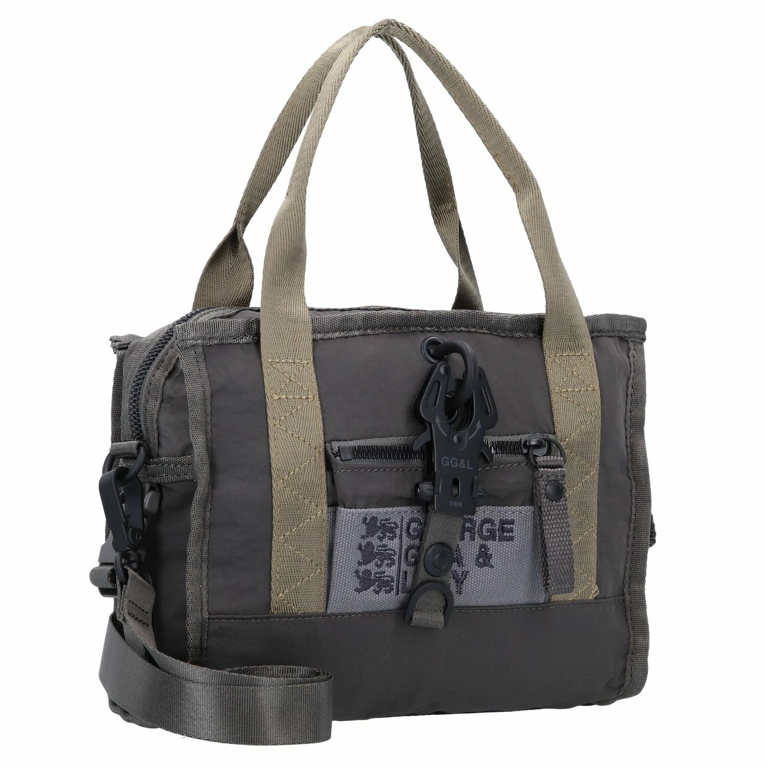 Stylische Handtasche von George Gina & Lucy mit abnehm- und verstellbarem Umhängeriemen und Schloss im Industrial Look. Das Hauptfach verfügt über ein Reißverschlussfach und ein Einschubfach. Auf der Vorderseite ist ein weiteres Fach mit Reißverschluss angebracht. Der ideale modische, wie auch praktische Begleiter für unterwegs.