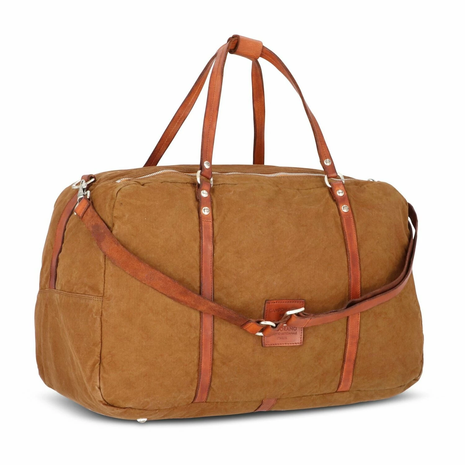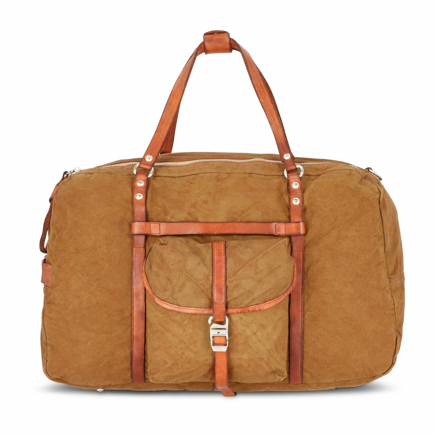 Strapazierfähige Baumwolle, hochwertiges und robustes Leder, sowie edle Akzente aus Metall machen diese Reisetasche von Campomaggi zu etwas Besonderem. Die Tasche verfügt über ein geräumiges Hauptfach mit Reißverschlussfach, sowie eine Vordertasche für mehr Stauraum. Mit abnehmbarem, längenverstellbarem Umhängeriemen. Ideal als Weekender.