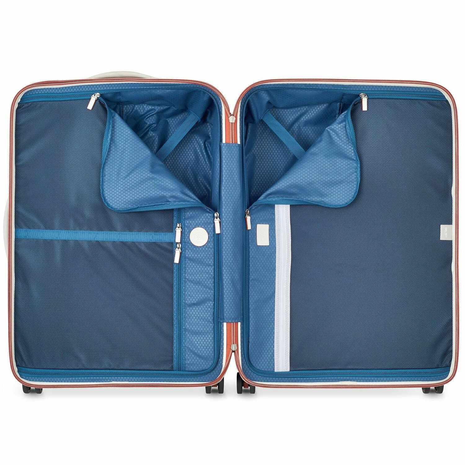 Luxuriöser Trolley der Marke Delsey mit 4 geräuscharmen Doppelrollen und arretierbarem Teleskopgriff. Der Trolley überzeugt nicht nur durch sein elegantes, klassisches Koffer-Design, sondern auch durch seine hohe Verarbeitungsqualität, Stabilität und Funktionalität. Er verfügt über ein geräumiges Hauptfach mit Kreuzpackriemen, ein großes Hemdenfach, ein Netzfach, ein Schuhbeutel und ist durch ein TSA-Schloss gesichert. So lässt sich komfortabel und stilvoll reisen.