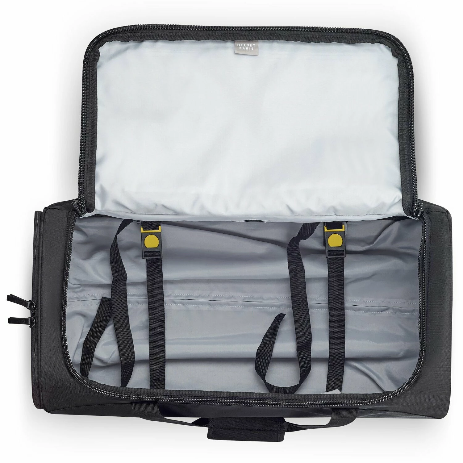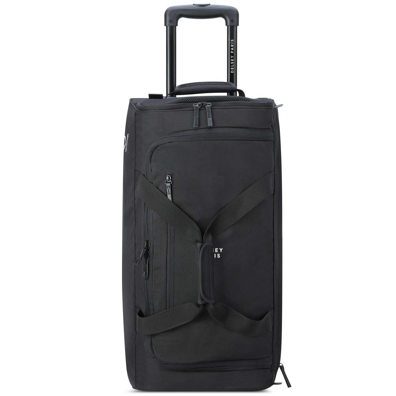 Praktische Trolley-Reisetasche der von Delsey besitzt ein großes Hauptfach mit Packriemen und Reißverschlussfach, sowie eine zusätzliche Reißverschlusstasche auf der Frontseite. Zudem ist die Reisetasche mit einem arretierbaren Teleskopgriff ausgestattet.