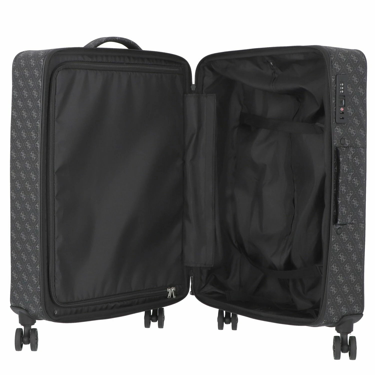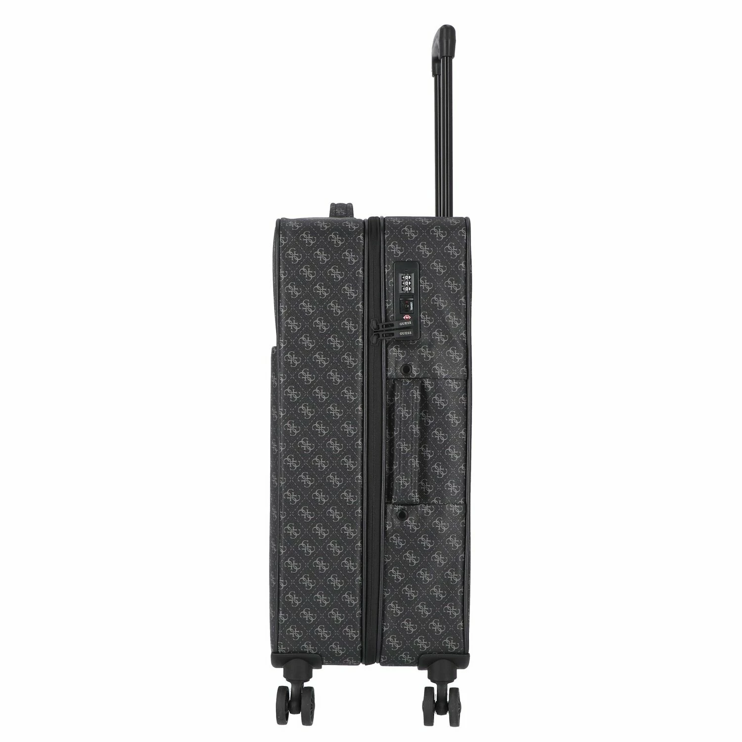 Robuster Trolley von Guess. Das geräumige Hauptfach bietet viel Platz, verfügt über ein Wäschefach sowie Gurte für eine optimale Organisation und ist mit einem TSA-Schloss geschützt. Der arretierbare Griff und die vier leichtläufigen Rollen machen diesen Trolley zum perfekten Begleiter auf Reisen.
