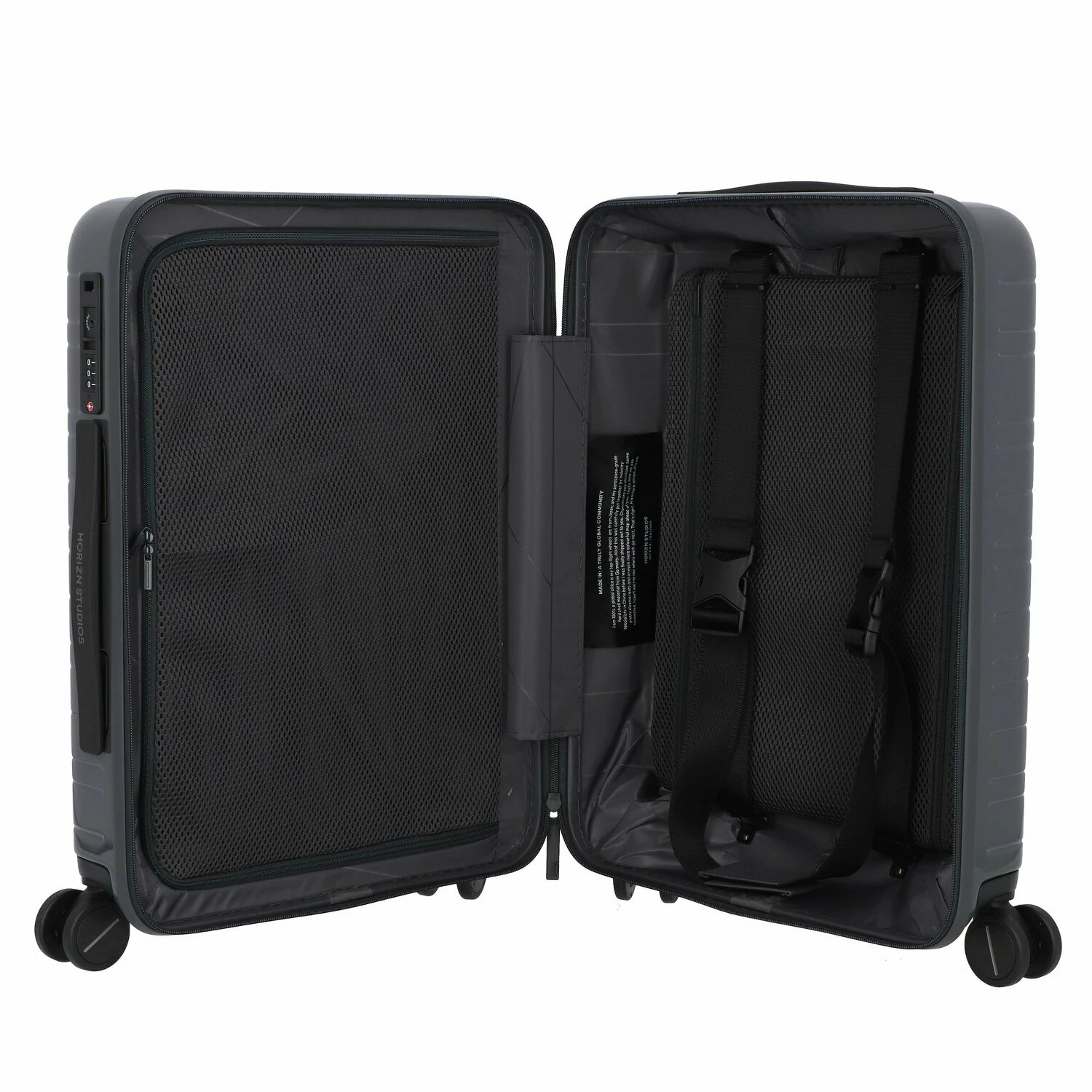 Stylischer 4-Rollen Kabinentrolley von Horizn Studios mit toller Innenausstattung und aus strapazierfähigem Polycarbonat. Dank der vier leichtläufigen Rollen und des arretierbaren Griffs, kann der Trolley bequem in alle Richtungen bewegt werden. Auch ein USB-Anschluss ist enthalten.