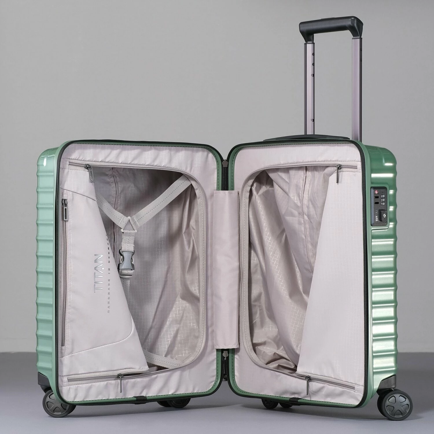 Luxuriöser Kabinentrolley der Marke Titan aus Polycarbonat mit 4 Rollen. Das dynamische Design, die hochwertige Verarbeitung und das stabile Material machen den Trolley zur optimalen Wahl für die nächste Reise. Mit geräumigem Hauptfach, Kreuzpackgurt und zwei raumteilenden Reißverschlussfächern sowie weiteren Fächern lässt sich ganz einfach Ordnung halten. Das TSA-Schloss sorgt für Sicherheit.