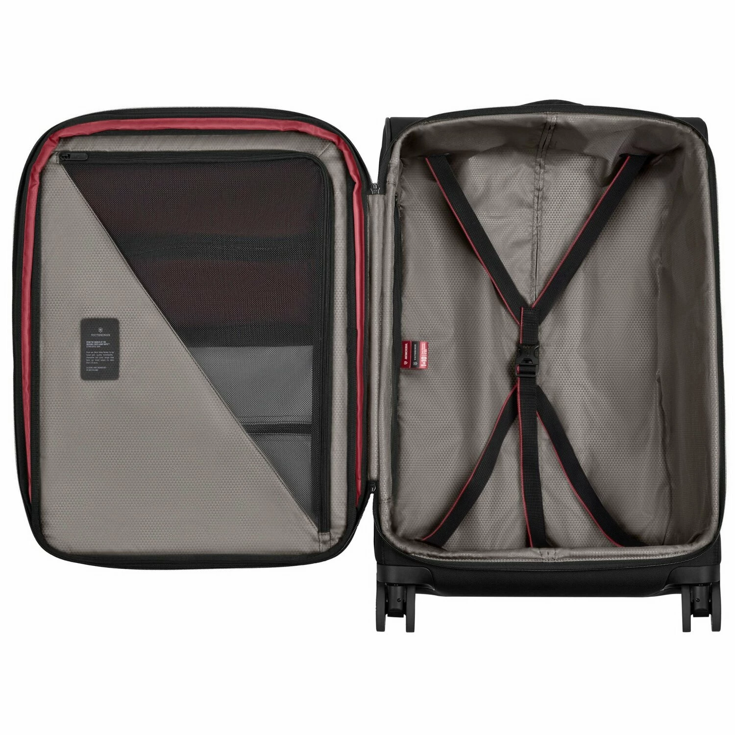 Funktionaler Trolley der Crosslight Serie von Victorinox. Der Trolley verfügt über ein geräumiges Hauptfach sowie zahlreiche Fächer und einen Organizer inkl. Nassfach zum Verstauen von Hygieneartikel, der auch einen Haken zum Aufhängen hat. Mittels Reißverschluss kann der Trolley in der Tiefe auf bis zu 33 cm erweitert und das Volumen dadurch auf 78 Liter vergrößert werden. Vier geräuscharme Rollen, arretierbarer Griff und ein integriertes TSA-Schloss für zusätzliche Sicherheit runden den Trolley ab.